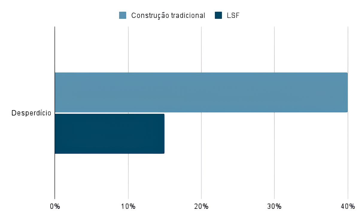 - LSF: Com a fabricação em ambiente controlado, o LSF reduz esse desperdício para cerca de 15%, como comprovado em estudos recentes.